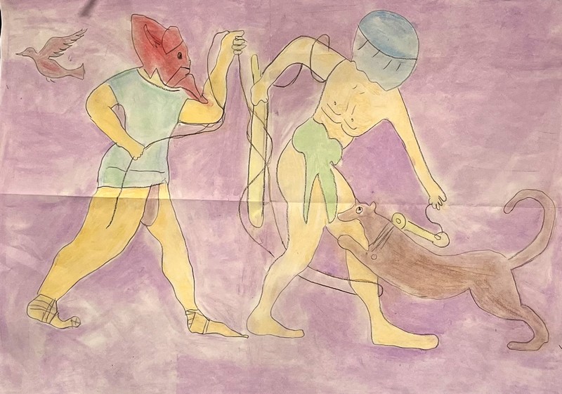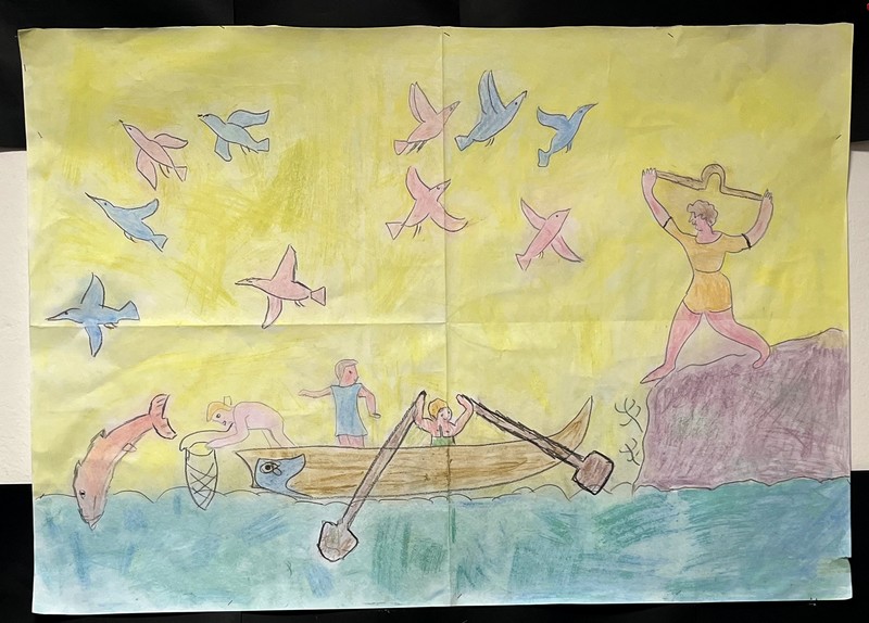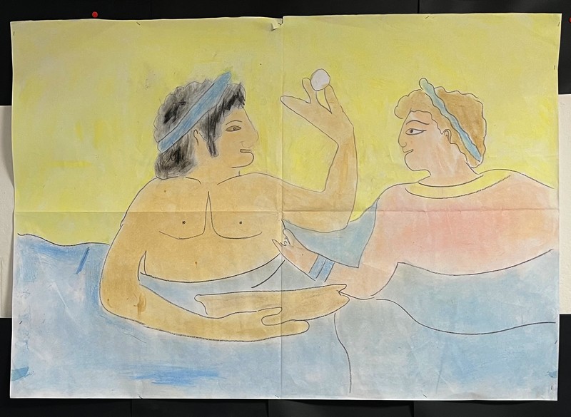 Dopo aver osservato tanti affreschi, conoscendo così tante informazioni sulla civiltà etrusca, ci siamo divisi in gruppi, ogni gruppo ha scelto un affresco che abbiamo provato a realizzare.