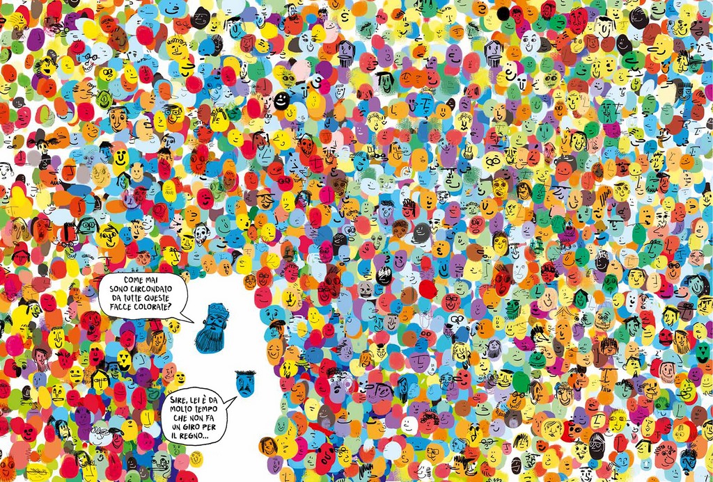 Per esempio ora stiamo facendo uno spettacolo su Il muro, un libro molto affascinante e educativo che, in poche parole, parla di un re che dopo tanto tempo esce dal suo castello e vede tante facce colorate per le strade, ma lui dice di essere il re solo delle facce blu. Allora decide di costruire un muro dove da una parte ci sono le facce blu e dall’altra quelle colorate, ma il re come tutte le persone ha i suoi bisogni: avere dei giardini, delle grandi fontane, dei giocolieri che facciano molto ridere, e tante altre cose. Però per tutto questo servono le facce di colore diverso. Per esempio, per i giardini servono le facce verdi o per una rinfrescante fontana le facce azzurre e così via. Fino a che dall’altra parte non rimangono pochissime facce mentre dalla parte del re si sta molto stretti. Allora il re decide di abbattere il muro, così sono tutti felici, contenti e… Colorati!
