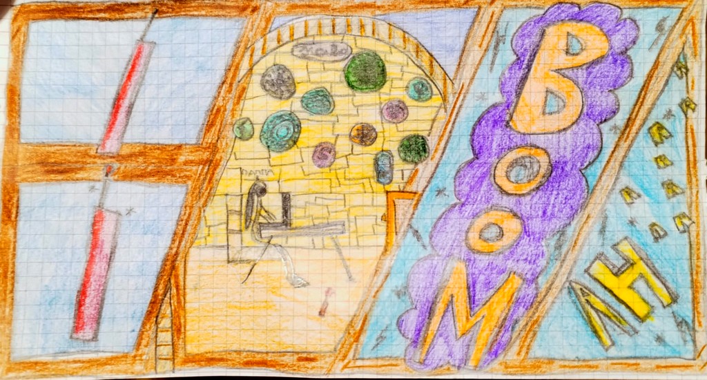 Di pomeriggio, dopo pranzo siamo andati a fare la spesa, quando mia mamma era al reparto frutta ed io e la nonna eravamo all’ingresso; la mia attenzione è stata attratta da dei fuochi d’artificio! All’inizio avevo notato che c’erano solo i fuochi d’artificio invece, in basso c’erano anche dei petardi. Quindi di corsa vado dalla nonna e le chiedo se posso prenderli per fare questo scherzo a mia mamma, la nonna mi dice di sì.