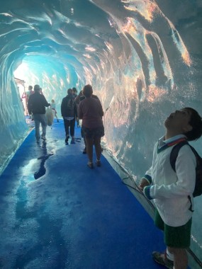 Una volta arrivati lì, si prende una funivia per arrivare al ghiacciaio che c’è sotto la roccia, un tunnel di ghiaccio molto antico, con mobili fatti di ghiaccio all’interno.