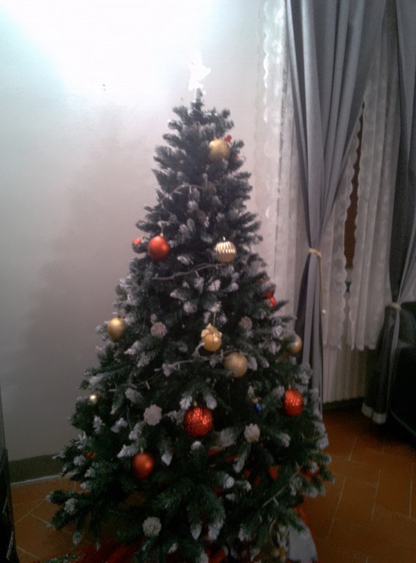 All’inizio avevamo messo le vecchie palline del mio piccolo nano alberino di Natale, poi io e mio papà abbiamo visto che per un albero grande non servivano delle piccole palline; perciò, mio papà è andato in un negozietto che vende addobbi di Natale a comprarne più grandi, di color rosso e dorate.