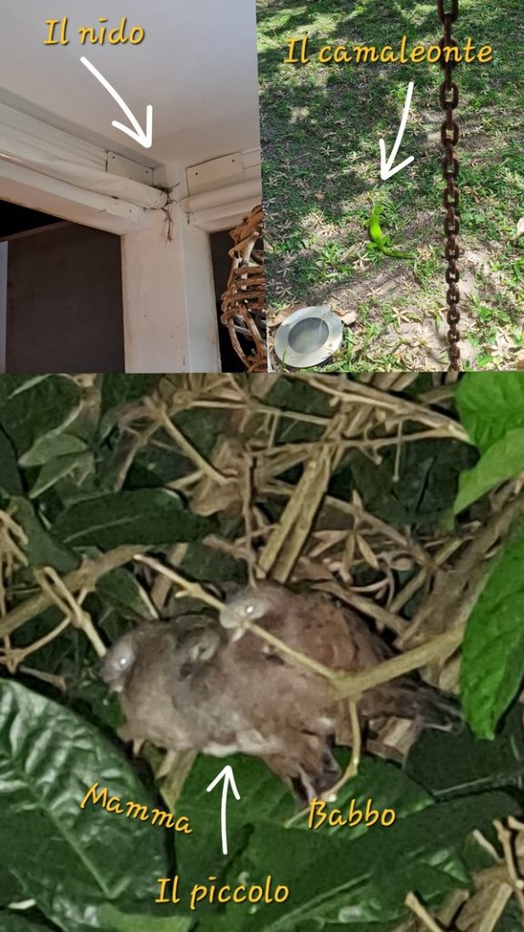 Il giorno successivo c’era un camaleonte che voleva mangiarsi il piccolo, ma mia mamma lo ha scacciato via con la scopa, il camaleonte si è fermato e l’uccellino è scappato dai suoi genitori.