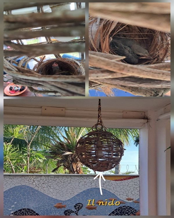 Il mio soggiorno non ha le pareti ma solo colonne ed è tutto aperto. Quindi per questo vengono tanti uccellini a cercare riparo e costruiscono i nidi nei vari punti più nascosti.