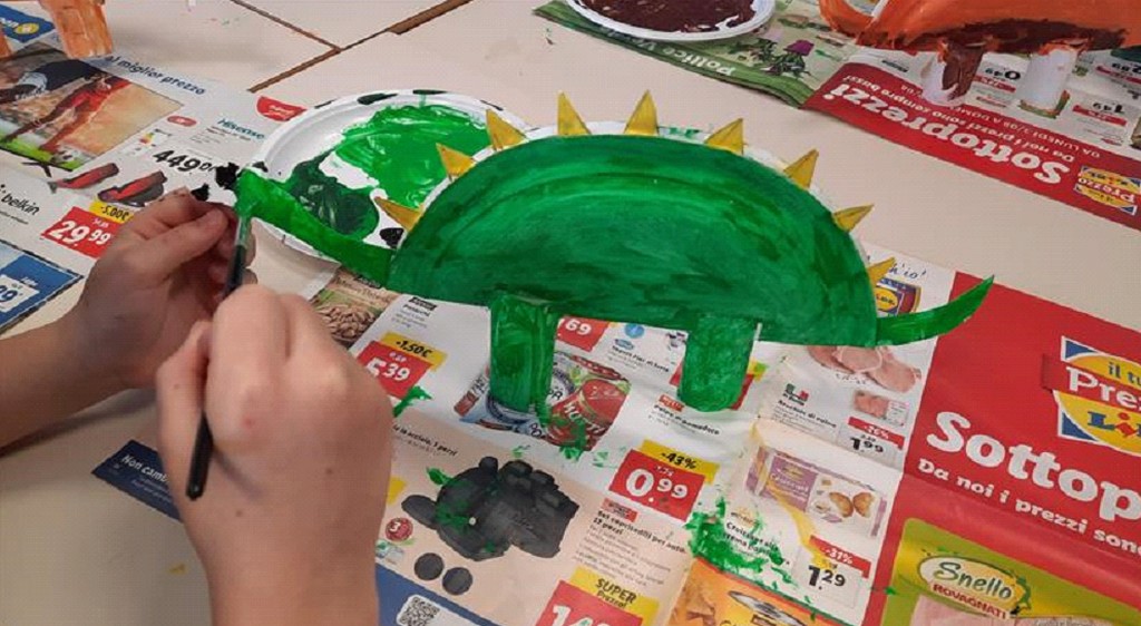 Incollate testa e coda al piatto e infine dipingete tutto il dinosauro.