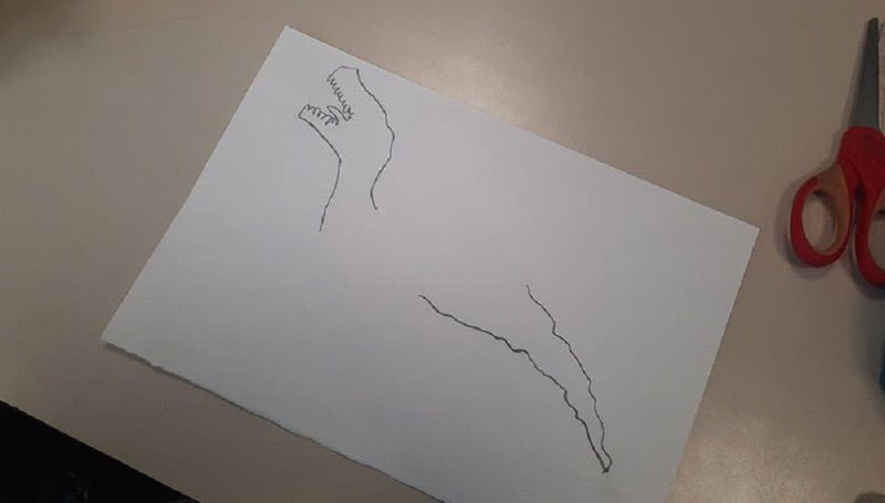 Disegnate su un foglio la testa e la coda di un dinosauro a piacere, poi tagliate le due forme.