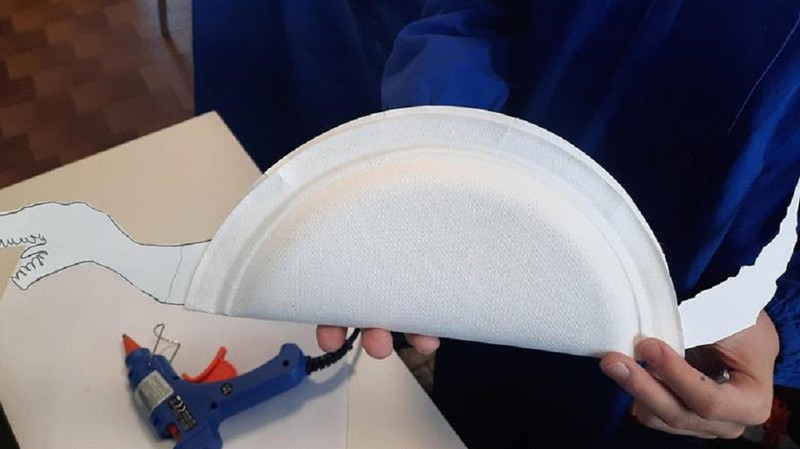 Prendete un piatto e piegatelo a metà; con la colla a caldo incollate nella parte dritta due mezzi tubi di carta igienica per formare le zampe.