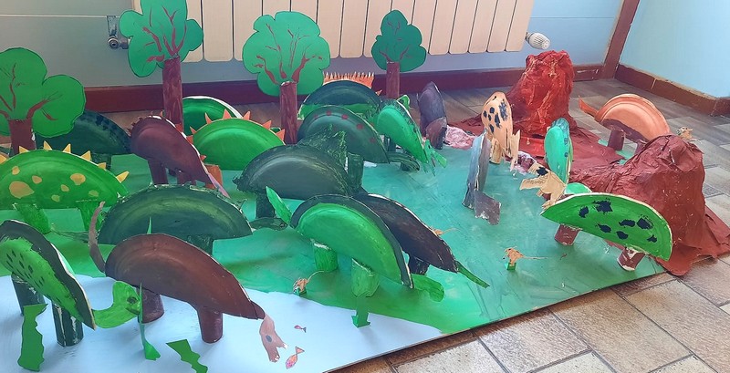 Noi abbiamo sistemato i nostri dinosauri su un plastico realizzato con cartapesta e colori a tempere.