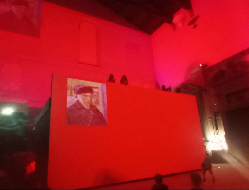 Subito dopo siamo entrati dentro la chiesa e le immagini proiettate erano enormi e una musica rilassante mi faceva sentire sereno e felice. Venivano proiettati a 360 gradi gli Iris, Il cielo Notturno stellato, i Mangiatori di patate, la Sedia gialla, e i suoi Autoritratti, anche quello che si vedeva che non aveva più un orecchio.