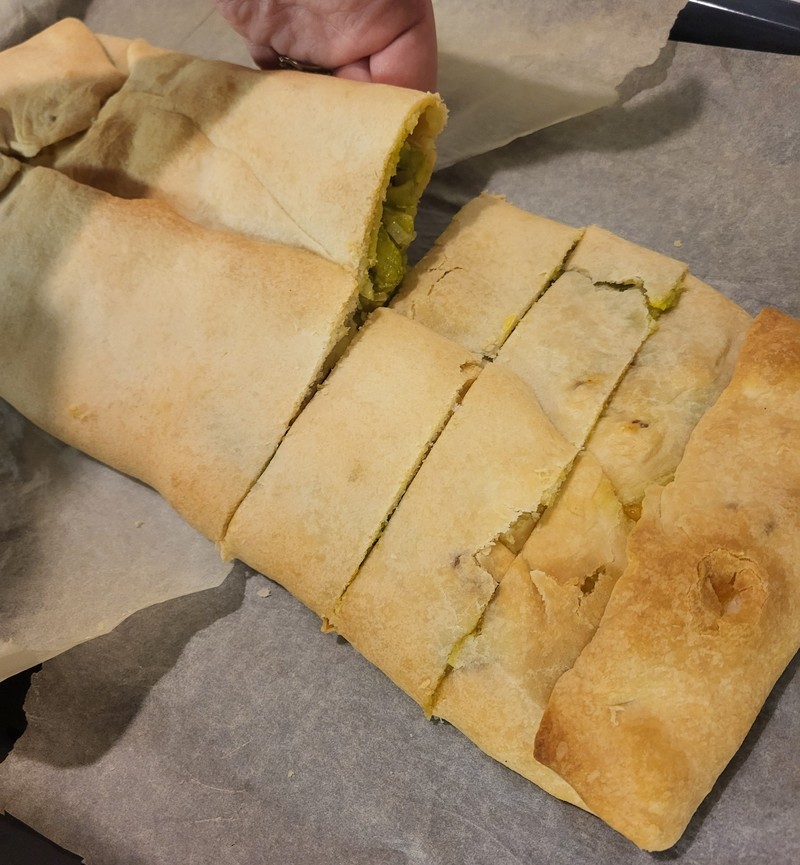 Abbiamo chiuso lo strudel e lo abbiamo messo in forno a 190 gradi per mezz’ora.