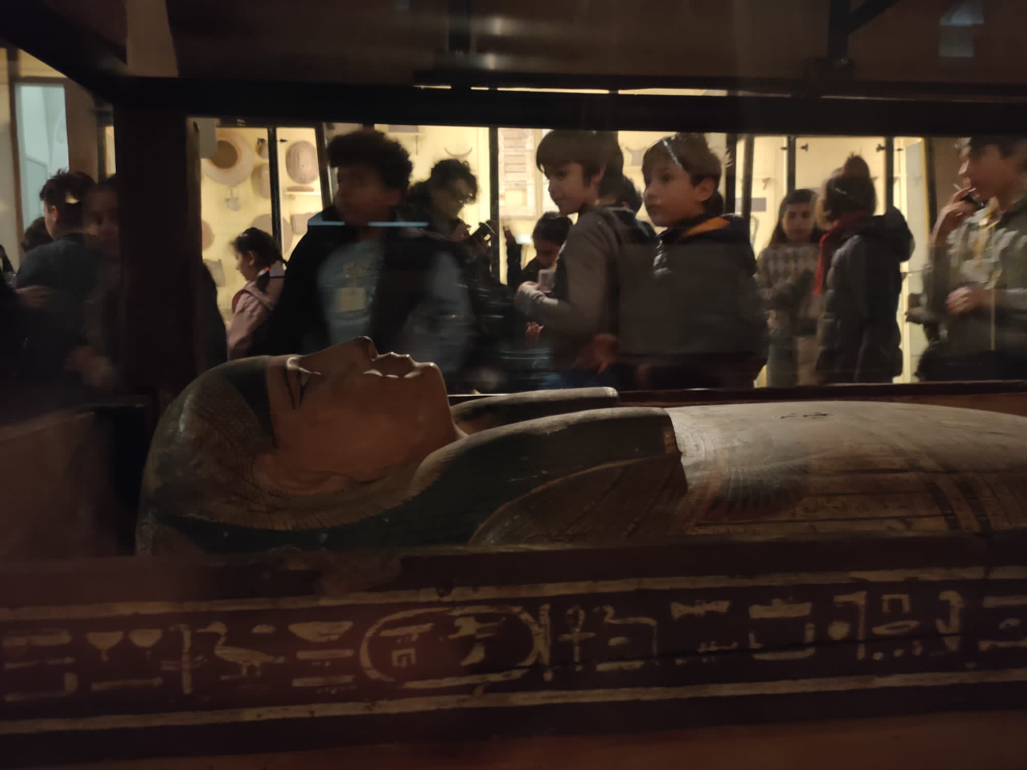 Infine, la guida ci ha portati in una stanza molto particolare. Le luci erano soffuse e si intravedevano delle teche di vetro. Avvicinandoci ci siamo accorti che dentro erano conservate delle mummie. Erano tutte bendate con fasce che un tempo erano bianche e che adesso si presentavano ingiallite e un po’ rovinate. In alcune mummie si intravedevano delle ossa, ma non tutte perché col passare del tempo alcune si sono polverizzate. Abbiamo anche visto le mummie di un piccolo coccodrillo e di un bambino.