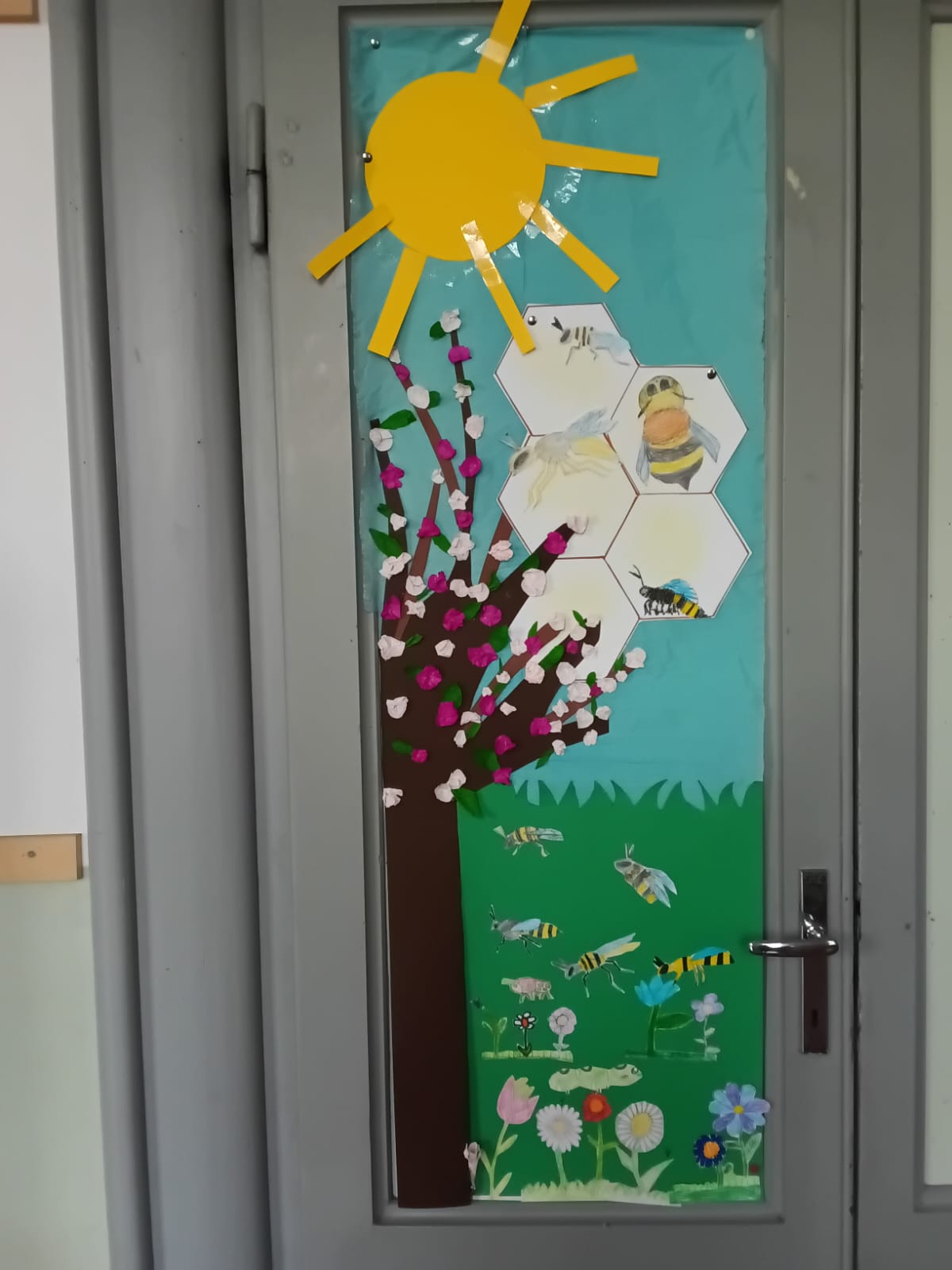Infine abbiamo creato un cartellone della primavera in cui abbiamo attaccato un albero fiorito con un bel prato, dei bellissimi fiori e le api fatte da noi!
