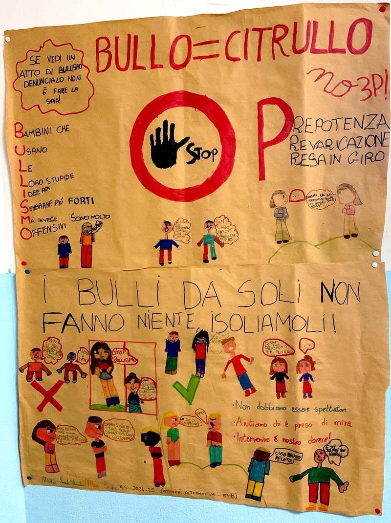 Ad Attività Alternativa abbiamo letto diverse storie su questa tematica, ad esempio quella di due bambini, Mario e Sara, che si trasferiscono in una nuova città e frequentano una nuova scuola: qui diventano vittime di ingiusti comportamenti da parte dei nuovi compagni solo perché Mario è paffuto e per questo viene preso di mira e accusato di essere ” un ladro di merende” e gli vengono fatti brutti scherzi (gli viene tolta la sedia per farlo cadere, gli riempiono il banco di cartacce delle merende.).