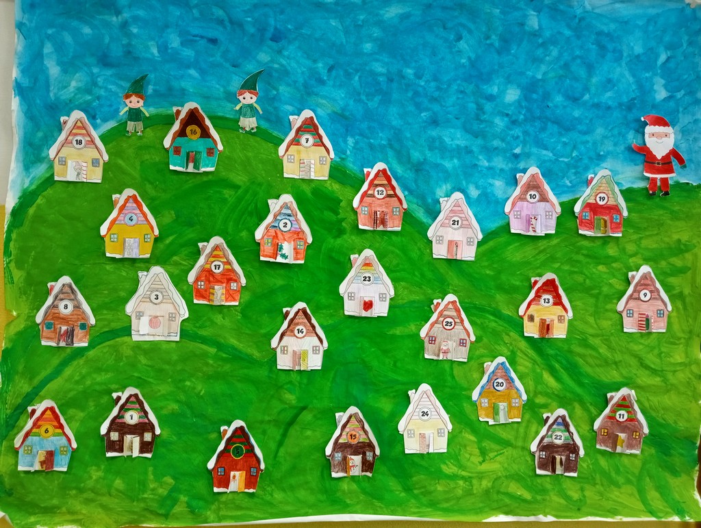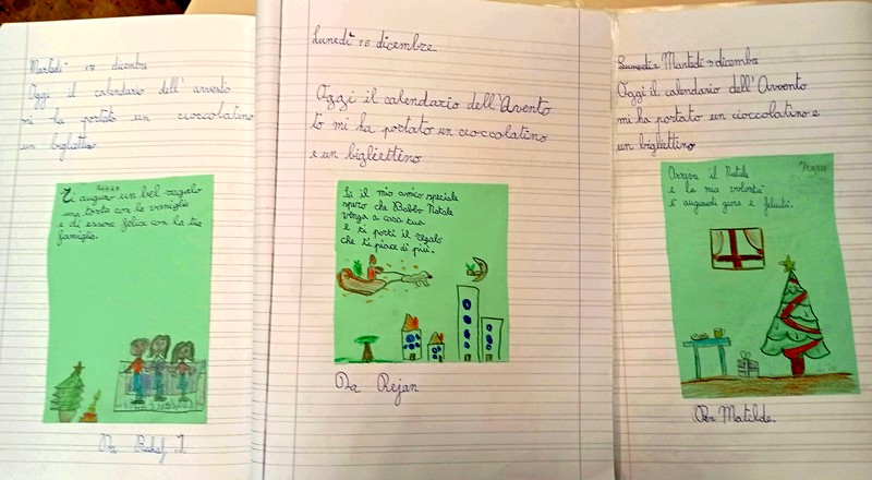 Il primo calendario è stato realizzato così: la nostra compagna Aurora, con l’aiuto della maestra, aveva pitturato su un grande cartellone un paesaggio invernale e vi abbiamo incollato sopra 24 casette di cartoncino colorate da tutti noi. Inoltre, ogni bambino ha scritto su un bigliettino verde una piccola poesia con un piccolo disegnino da pescare insieme ai cioccolatini. Su questi bigliettini ognuno doveva augurare qualcosa di bello a chi lo avrebbe ricevuto. Abbiamo poi incollato questi biglietti sul quaderno, come ricordo.
