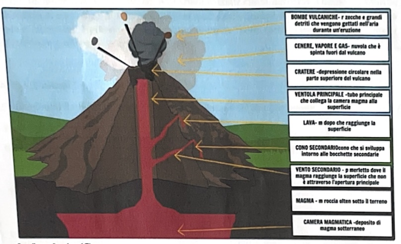 Un vulcano è una spaccatura nella crosta terrestre da cui fuoriescono materiali incandescenti provenienti dall’interno della Terra, come il magma. Quando il magma arriva in superficie, si trasforma in lava. I vulcani possono avere forme diverse, ma tutti hanno alcune parti principali.