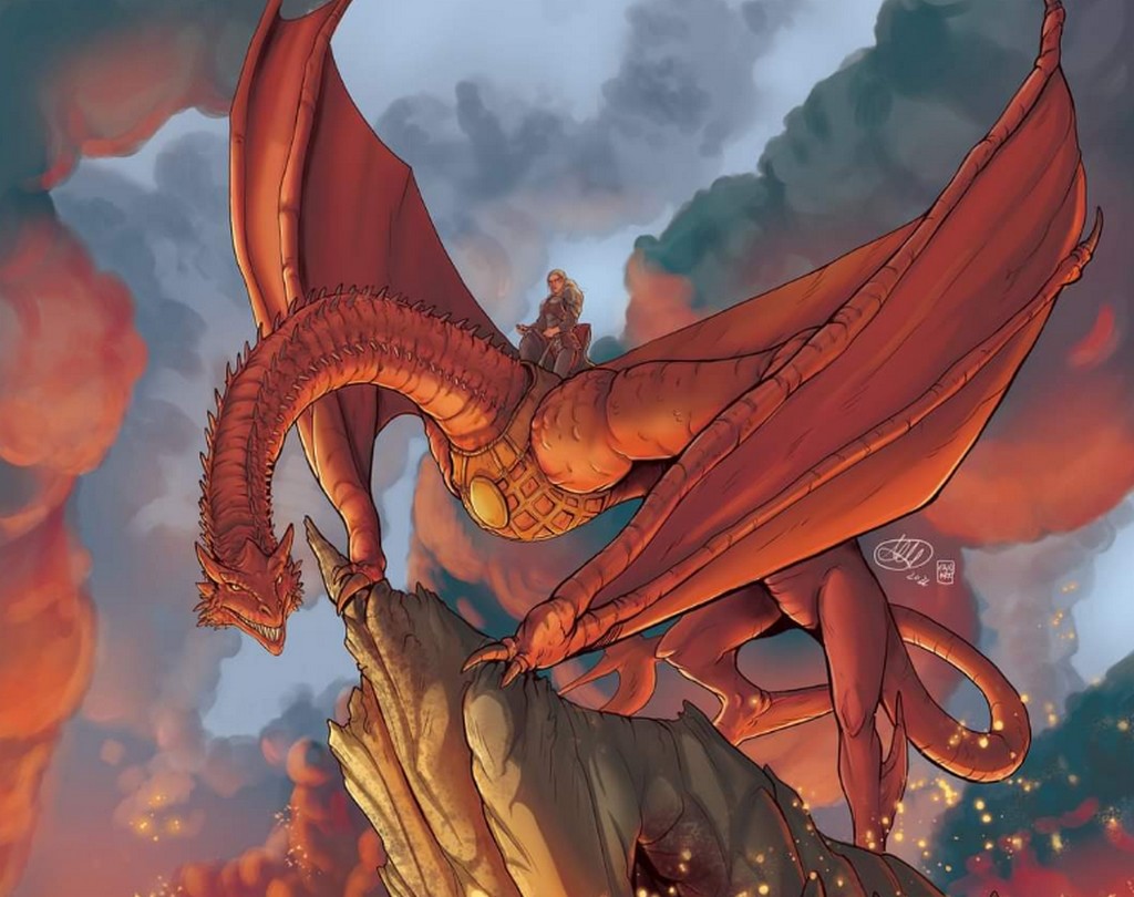 Dopo aver marciato un po’ si imbatté in una cupa e strana grotta, rimase impalato a fissarla, finché non sentì uno spaventoso e potente ruggito, ed il drago uscì; aveva spine dalla testa alla coda, due zampe dotate di spaventosi artigli e le ali rosse con piccole mani.