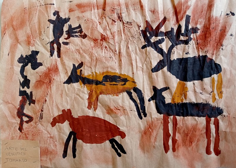 Abbiamo usato dei fogli di carta marrone chiaro. L’esperta ha preparato dei colori naturali in polvere come l’ocra rossa e quella gialla. Abbiamo usato dei piattini in cui abbiamo mischiato la colla vinavil, l’acqua e i colori in polvere e abbiamo iniziato a pitturare. Ad ogni bambino è stato assegnato un disegno diverso. Il mio rappresentava una scena di caccia dell’era del Neolitico. Questa attività è stata bella e interessante.
