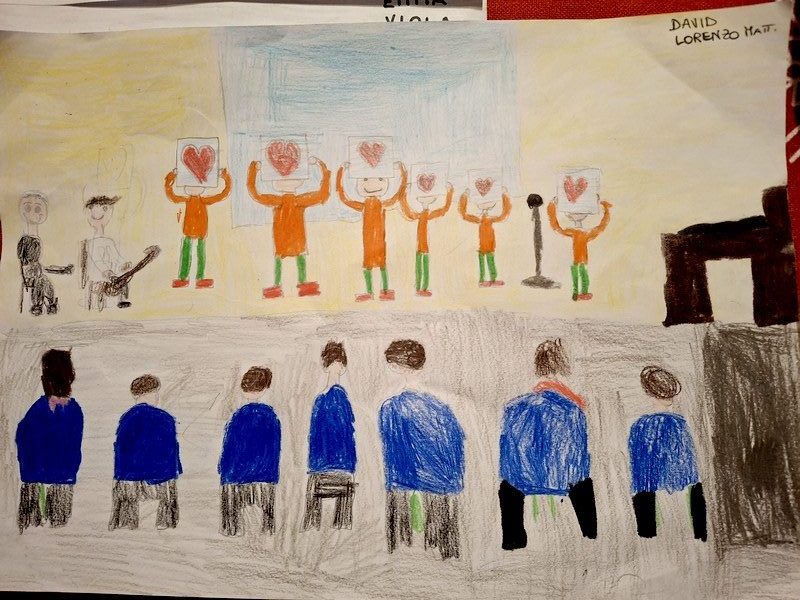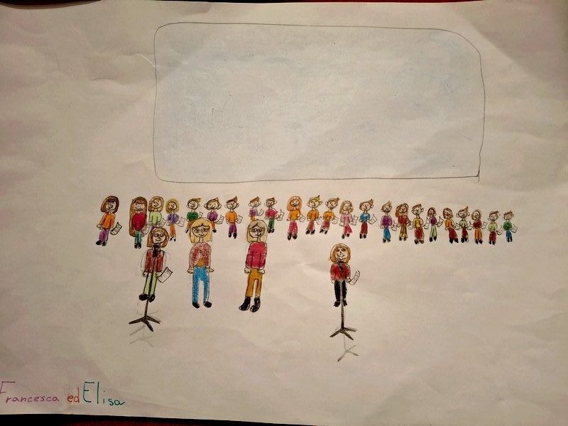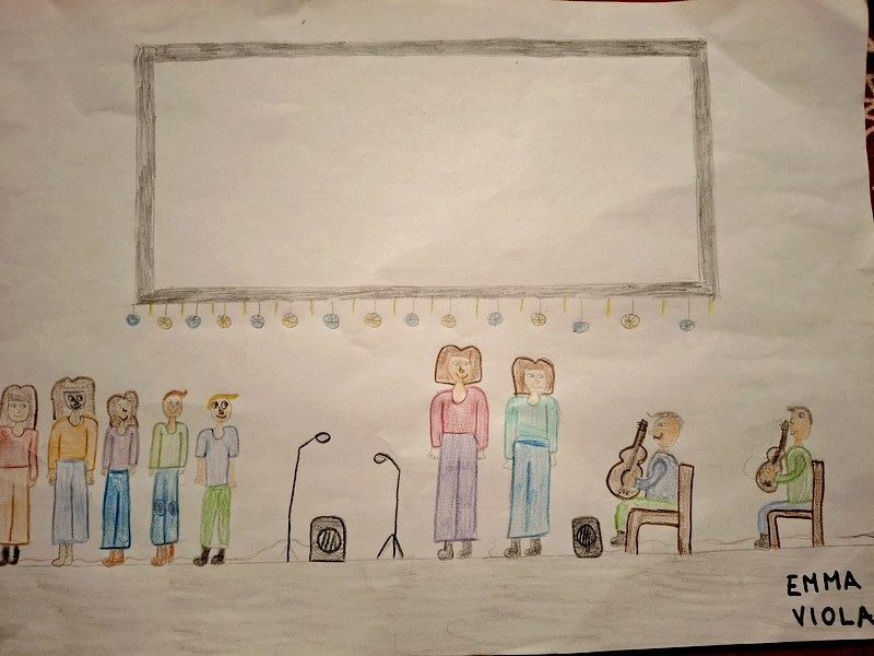 Durante la preparazione delle canzoni abbiamo capito che ci serviva un accompagnamento con la chitarra, quindi la nostra maestra Margherita ha chiesto, a suo figlio Niccolò e a suo marito Maurizio, se potevano accompagnarci con la chitarra.