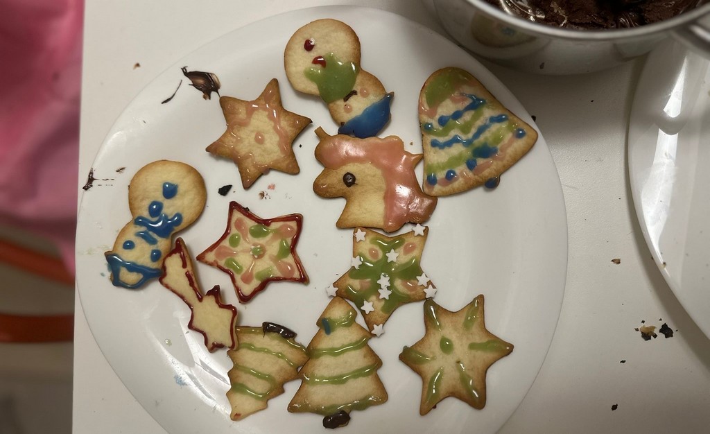 Ci siamo trasformate in vere pasticcere e abbiamo preparato tantissimi biscotti natalizi: alberi, fiocchi di neve e stelle. Dopo averli infornati, è arrivata la parte più divertente: decorarli con penne di glassa colorata e zuccherini brillanti. Li abbiamo mangiati accompagnati da un caldo tè cinese… erano una vera delizia!