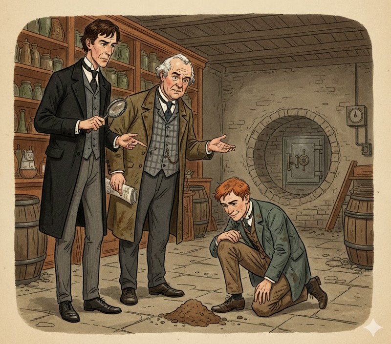 Holmes resta subito incuriosito dalla stranezza del caso. Analizzando il comportamento dell’assistente e un dettaglio particolare — i suoi pantaloni sporchi di fango sulle ginocchia — l’investigatore capisce che dietro questa assurda associazione si nasconde in realtà un piano criminale.