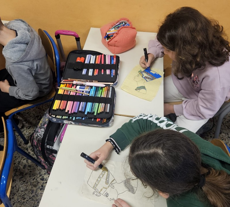 Per prima cosa abbiamo preso le misure del disegno e abbiamo attaccato delle strisce di scotch leggermente sovrapposte in orizzontale e poi in verticale sul banco, così abbiamo formato il papiro con lo scotch al posto delle foglie di papiro. Sono state distribuite le immagini e io ho scelto il profilo della regina Nefertiti. Per trasferire il disegno sul nostro papiro la maestra ci ha fatto usare i fogli di carta carbone. Una volta trasferito, gli uniposca ci sono serviti per ripassare le linee del disegno. Quando tutti avevamo colorato abbiamo sparso il caffè nello sfondo per dare l’idea del colore antico.