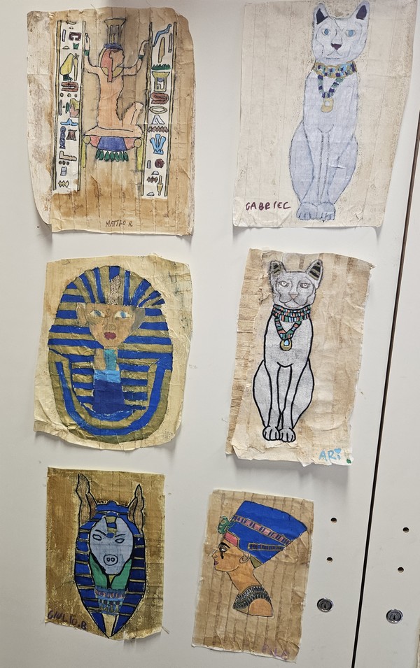 Visto che stiamo studiando gli Egizi abbiamo ricreato i papiri con solo scotch di carta che si stacca facilmente, uniposca colorati, carta carbone, matita appuntita, caffè raffreddato e l’immagine di una divinità egizia, un faraone o una regina.
