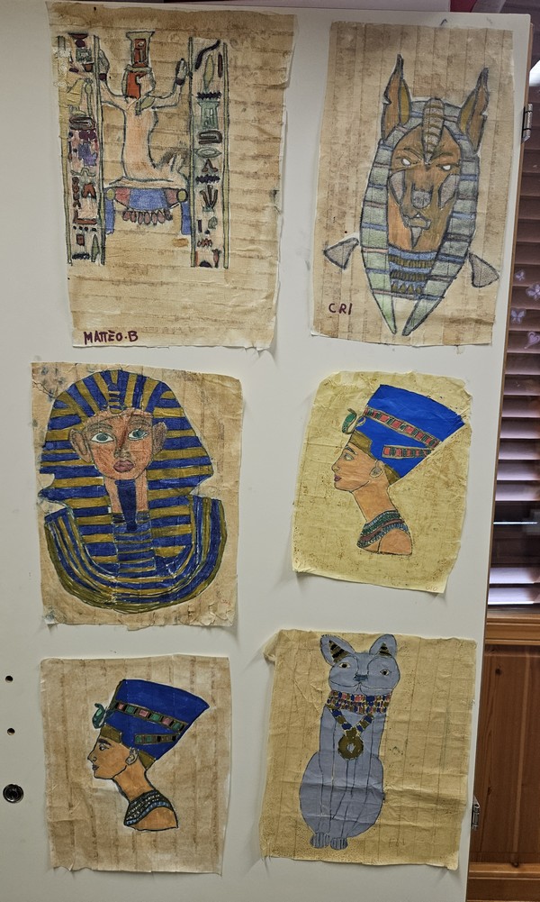 Tutti i disegni sono stati appesi sulle ante dell’armadio per farli asciugare, sfortunatamente proprio un angolino del mio papiro si è staccato e una goccia di caffè è colata sotto l’occhio di Nefertiti, sembrava veramente che piangesse!
