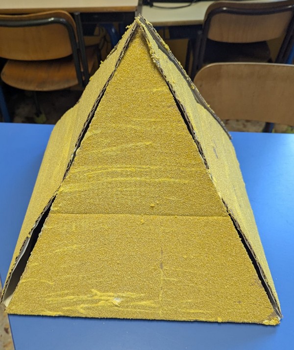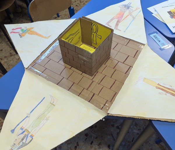 ​IO ERO NEL PRIMO GRUPPO ED ERO CON MATTEO B., ALICE E BEATRICE. CI SIAMO SUBITO MESSI AL LAVORO E ABBIAMO COMINCIATO A RITAGLIARE; IO TENEVO IL CARTONE. POI, UNA VOLTA FINITO DI RITAGLIARE, CI SIAMO MESSI A RICOPRIRE DI COLLA LE MURA DELLA PIRAMIDE PER POI VERSARCI LA FARINA DI MAIS.