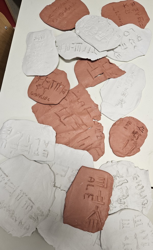 Oggi io e Gregorio vogliamo raccontarvi un’attività bellissima che abbiamo fatto in classe con la nostra maestra di arte e storia: abbiamo creato delle vere tavolette in scrittura cuneiforme, proprio come facevano gli antichi Sumeri!