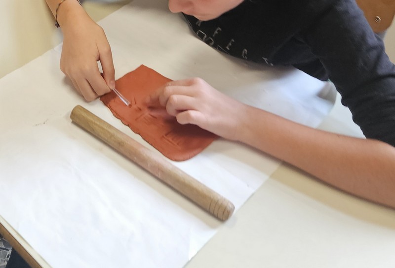 - Scriviamo: usando lo stecchetto appuntito, abbiamo inciso il nostro nome in Sumero. Potete scrivere quello che volete, ma attenzione: bisogna calcolare bene lo spazio! A Gregorio, ad esempio, la scritta non è entrata tutta al primo colpo, quindi bisogna essere precisi.