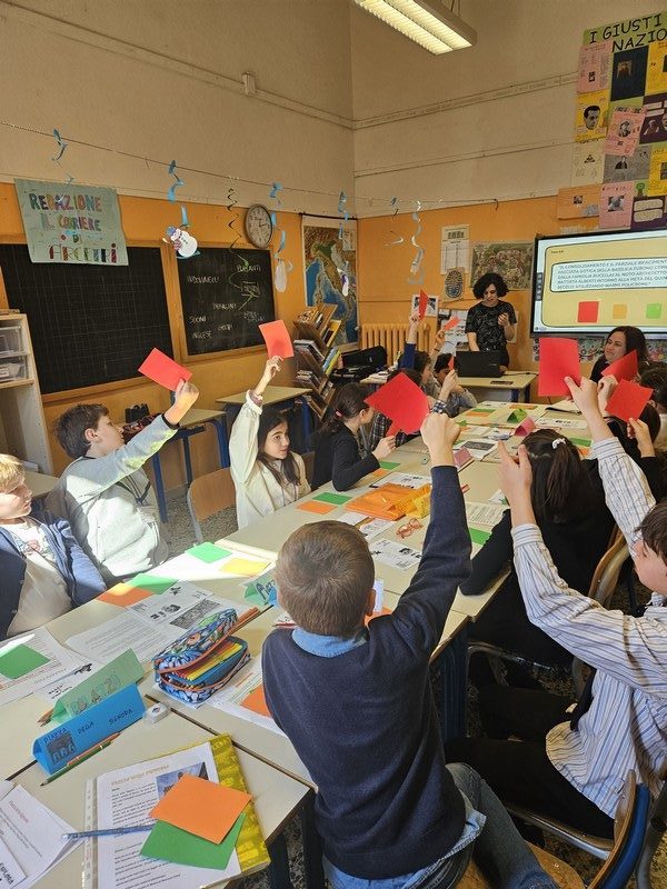 Visto che la maestra sta facendo un esame per “diventare di ruolo” (cioè per essere assunta a tempo indeterminato), ha invitato in classe la preside per farle vedere il nostro lavoro. Per l’occasione abbiamo creato una vera redazione in classe, vestendoci persino da giornalisti! Abbiamo lavorato proprio come dei veri reporter, con la preside a fare da spettatrice.