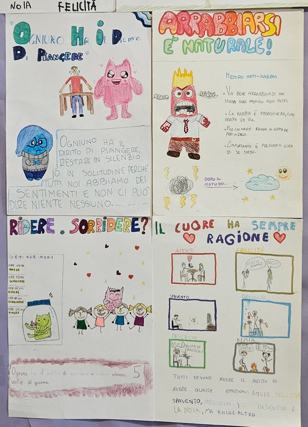 Per iniziare, la maestra ci ha diviso in coppie e ha assegnato a ciascuna delle emozioni diverse. Il compito di ogni coppia era descrivere il sentimento ricevuto su un cartoncino, animandolo con disegni e colori vivaci. Abbiamo lavorato sodo per una settimana e, quando finalmente è arrivato il “gran giorno”, ogni gruppo ha consegnato il proprio capolavoro.