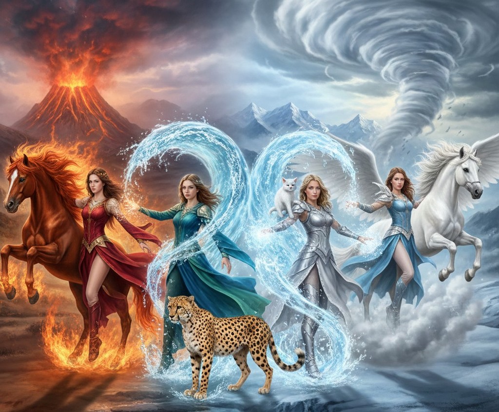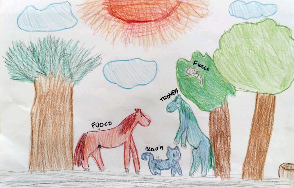 In giardino, a ricreazione, tutte insieme con la nostra amica Giulia, abbiamo inventato un gioco dove siamo sorelle e abbiamo dei poteri magici legati alla natura: Giulia ha il potere del fuoco, Tea ha il potere dell’acqua, Samantha del ghiaccio e Margherita dell’aria (tornado, nuvole, vento ecc.) e tutte quante abbiamo degli animali che si chiamano: Acqua, il ghepardo di Tea, Tromba, il cavallo di Margherita e Fuoco il cavallo di Giulia, infine Fiocco il gatto di Samantha.