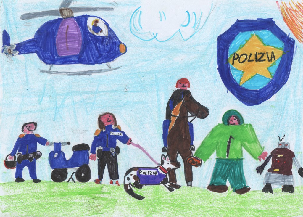 I poliziotti ci hanno detto che il loro lavoro è diviso in tanti reparti: ci sono quelli che disattivano le bombe e si chiamano Artificieri, quelli che prendono le impronte digitali, come si vede nei film per scoprire chi è l’assassino, ci sono i poliziotti a cavallo che controllano che vada tutto bene durante gli eventi speciali, come ad esempio quelli sportivi, c’è, anche, la polizia Cinofila che, insieme ai cani addestrati, scopre la droga e le bombe.