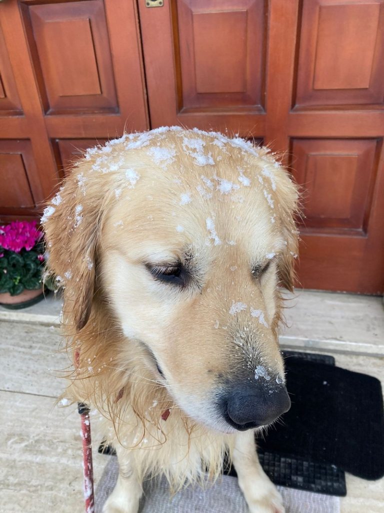 E’ di taglia media; è un Golden Retrivier con il pelo di colore oro.
