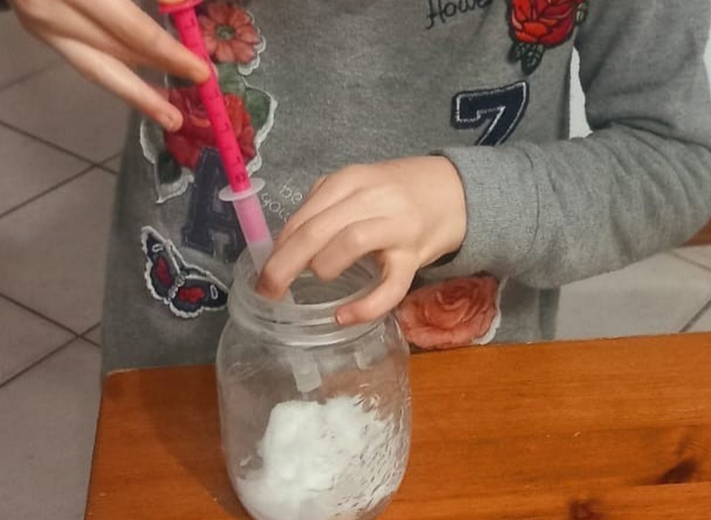 Ho messo il cotone dentro il vasetto e l’ho leggermente annaffiato. Dopo ho preso il seme di fagiolo e l’ho posizionato dentro il cotone.
