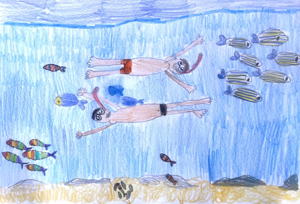 Allora abbiamo preso maschera e boccaglio e abbiamo nuotato a largo fino a quando abbiamo visto un banco di 7 pesci grandi quanto il mio braccio e mi sono messo ad inseguirli nuotando alla velocità di un razzo! Ma non ce l ho fatta a raggiungerli…