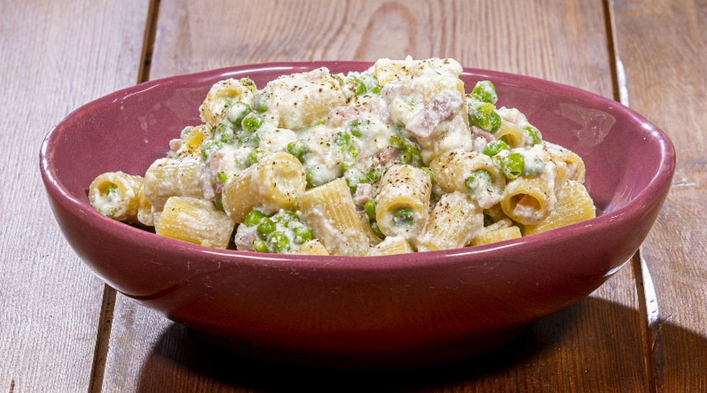 Pasta corta 400 g, cipolla 150 g, piselli 300 g, prosciutto a cubetti 150g, olio extra vergine d’ oliva, sale e pepe.