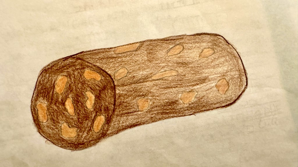 Quindi abbiamo trasferito su dei fogli di carta forno per fare i salami e sono venute due grandi caramelle. L’abbiamo racchiuse nell’ alluminio e messe in congelatore per 30 minuti e poi in frigo. Prima di mangiarle l’abbiamo fatte rotolare nello zucchero a velo.