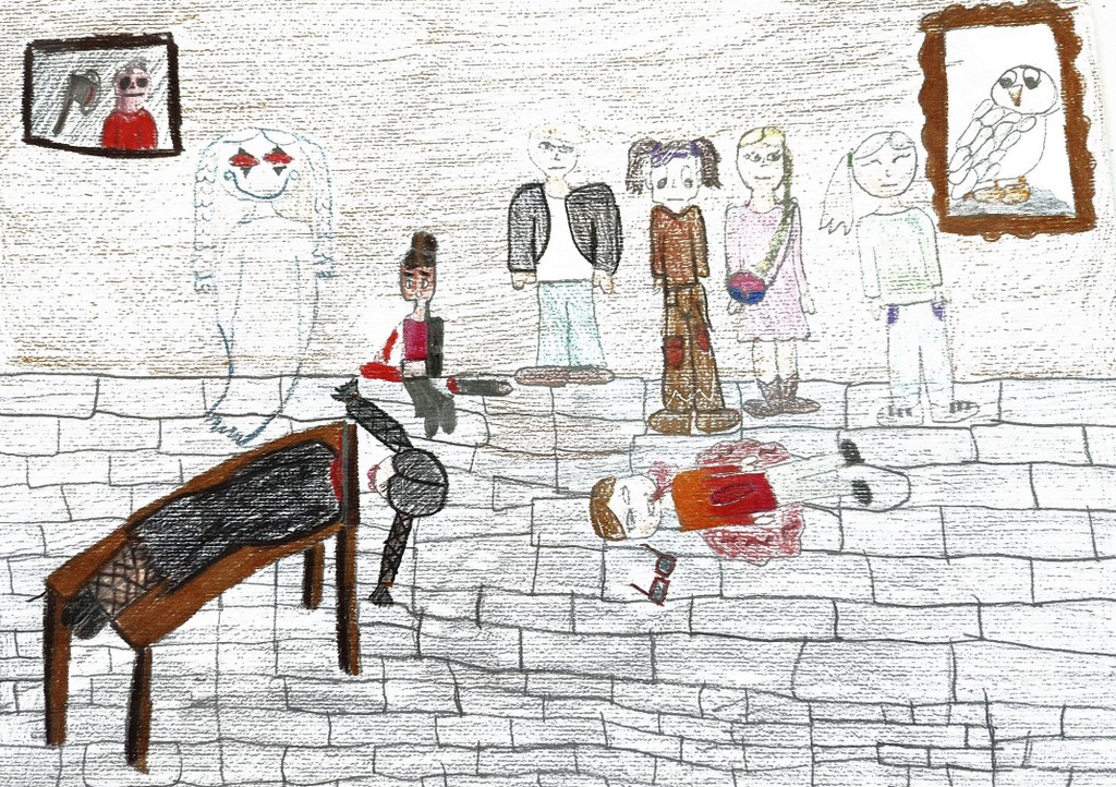 La bambina spettro fece finta di chiedergli scusa e gli offrì un the, tirò un’ascia contro una ragazza ma si schivò e finì su un quadro.
